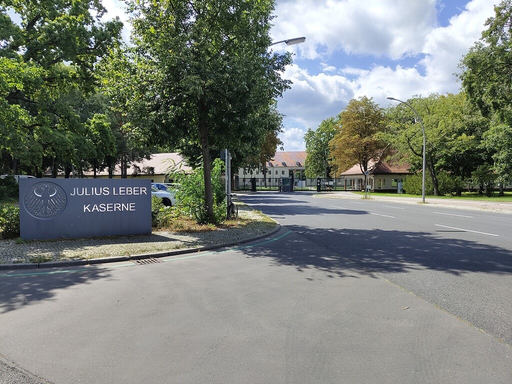 Ziemlich genau ein Jahr früher (5. März 2024) wurde die Stolperschwelle an der Julius-Leber-Kaserne in Reinickendorf eingeweiht. Das Gelände ist riesig, falls ihr hinwollt, dann am besten über die gleichnamige Bushaltestelle, von wo ihr ein Eingangstor sehen könnt.