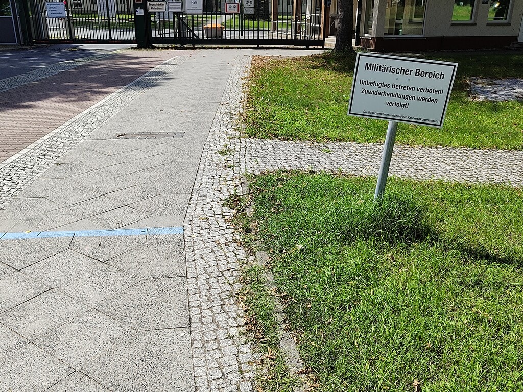 Im Internet hatte ich gelesen, dass die Stolperschwelle „vor dem öffentlichen Informations- und Gedenkort der Julius-Leber-Kaserne in Berlin enthüllt“ wurde. Als ich darauf zulief schien es mir dann aber nicht so, als sei der Ort öffentlich. Zumindest warnten mich ein Schild und eine blaue Linie vor dem Betreten.