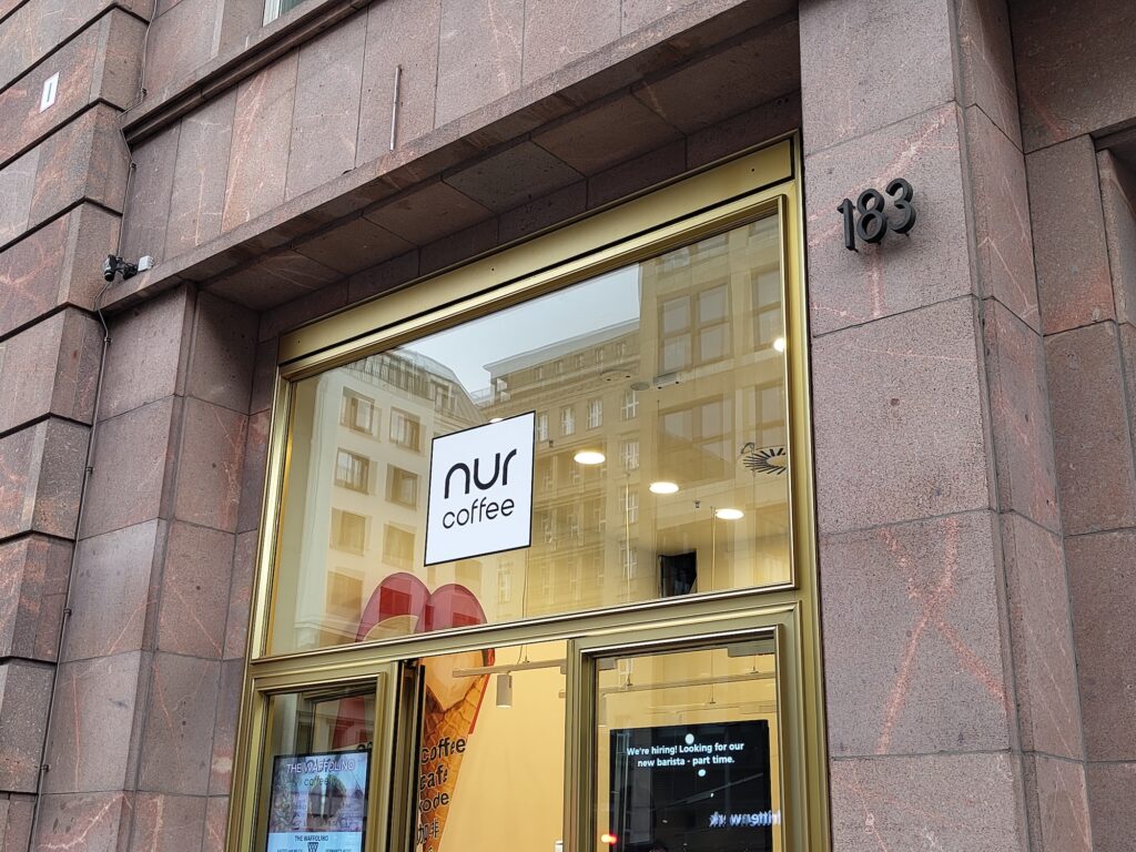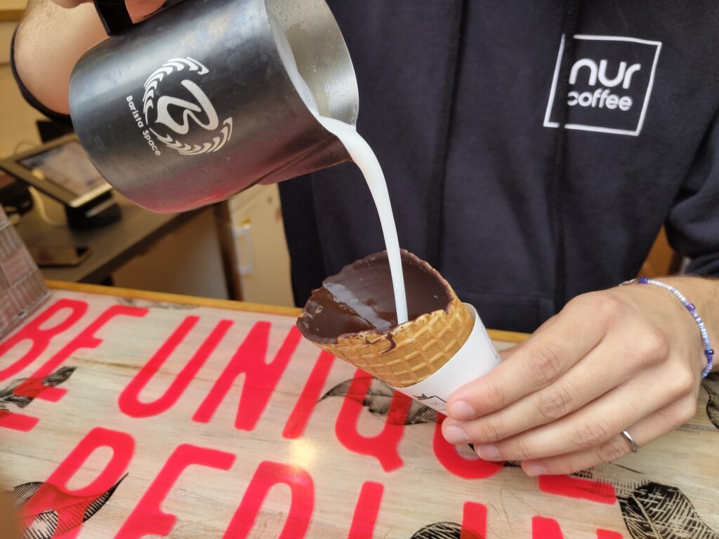 Als wir davor standen, waren wir einen Moment unentschlossen, denn das 2024 eröffnete nur coffee ist kein Café zum Sitzen, sondern nur ein To-go-Fenster. Der nächste Schock: Ein Kaffee, Kakao oder Cappuccino in der Waffel – ein sogenannter Waffolino – kostet 9,50 Euro. Wer oben an seiner mit Schokolade ausgegossenen Waffel noch einen Rand aus Pistaziensplittern möchte, zahlt nochmal 3 Euro oben drauf. Holy Shit! Wir wollten es aber trotzdem testen. Schon die Zubereitung war ein kleines Erlebnis.