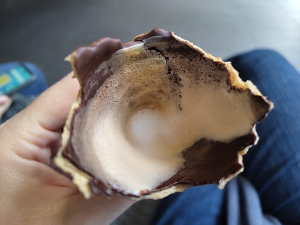 Bevor ihr das Getränk gereicht bekommt, gibt’s noch einen wichtigen Tipp: erst trinken, dann abbeissen! Fancy ausgesehen hat der Waffelcappuccino jedenfalls. Auch ein Herz hat der Barista im Schaum hinbekommen. Und die Schokolade sorgt tatsächlich dafür, dass der Kaffee die Waffel nicht aufweicht.